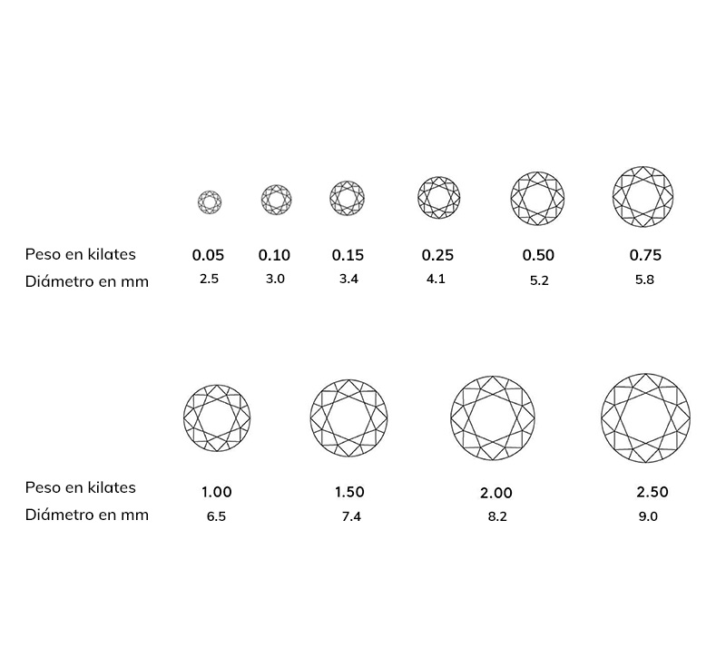 El tamaño de un diamante se mide en quilates y determina el peso (equivalente a 0.20 gramos). Es importante enfatizar que el tamaño de un diamante no indica su valor.