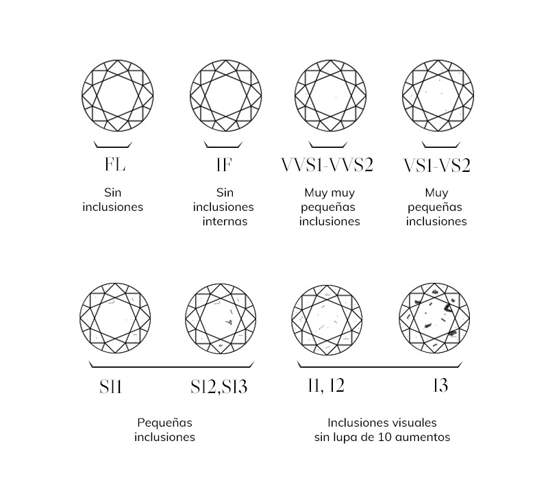 La claridad del diamante es un indicador de su pureza y rareza definida como la visibilidad de imperfecciones bajo una amplificación de 10X. Si bajo esta magnificación, no presente alguna inclusión (imperfección interna) o manchas visibles (imperfecciones externas) se dice que es una piedra impecable o “FL” por sus siglas en inglés.